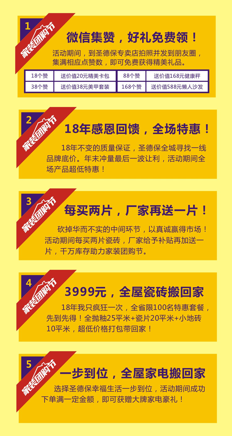 家裝裝修設計陶瓷品牌圣德保陶瓷為了辭謝新老客戶的厚愛,現正在全國各地開展家裝團購節活動,廠家全程支持,優惠的價格讓利于您,更有豐厚的獎品拿,詳情請咨詢當地圣德保專賣店。