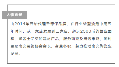2014年正趕上陶瓷行業轉型大潮,任總選擇代理圣德保這個品牌是因為圣德保擁有完善的產品線以及有一定的知名度,本著試試做的心態開始代理圣德保,得到廠家幫扶,加上自身努力,生意做得越做越大,繼2014年順慶店后,又于2017年在高坪、2018年在嘉陵打造大型建材實體店。這種持續發展不僅使圣德保品牌知名度與影響力在南充市場最大限度擴大化,也讓任總實現事業的夢想和收獲市場的肯定。